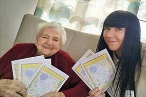 Residents at Borough Care’s Reinbek home in Davenport have been creating some very special messages for their family and friends, courtesy of Lauren Whittaker, a Senior Care Assistant at the home.  In addition to the regular Skype, WhatsApp and telephone call contact between residents and their families, Lauren had the idea to do something even more personal, which would be a welcome and spirit-lifting surprise for families who are missing their loved ones.  She designed and printed some beautiful cards, which included a special message on the front.  Each of the residents wrote their own note inside the cards, before they were sent off to their families.  Jean and lauren sending special wishes